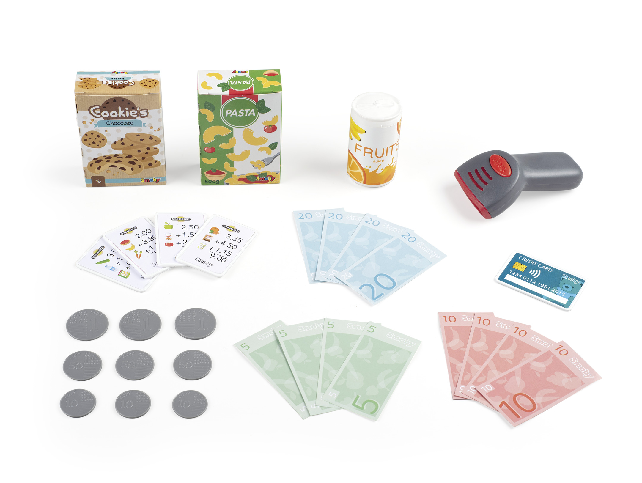 Kassaaparaadiga saab arveldada kasutades mängusularaha või mängukrediitkaarti. Komplektis on 12 kupüüri, 9 münti ja 1 pangakaart.