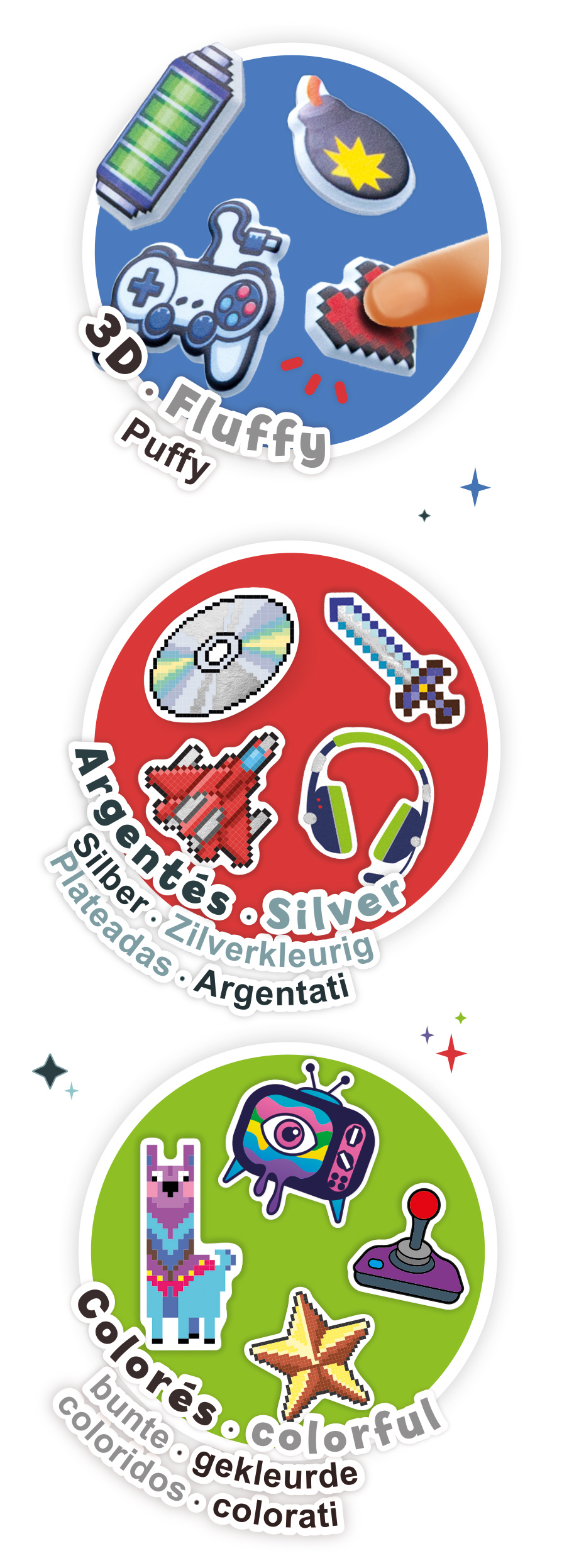 Buki gaming ehk videomängude teemaline kleebiste komplekt on laste kleepsukomplekt 200+ videomänguteemalise kleepsuga meisterdamiseks ja vihikute kaunistamiseks. Komplektis on viis A5 lehte värviliste kleepsudega, üks metallilise kontuuriga leht ja üks pehme 3D-kleepsude leht. Kleepsud sobivad koolitarvetele, päevikusse ja loovprojektidesse nii kodus kui ka teel olles. Sobib alates 6. eluaastast.