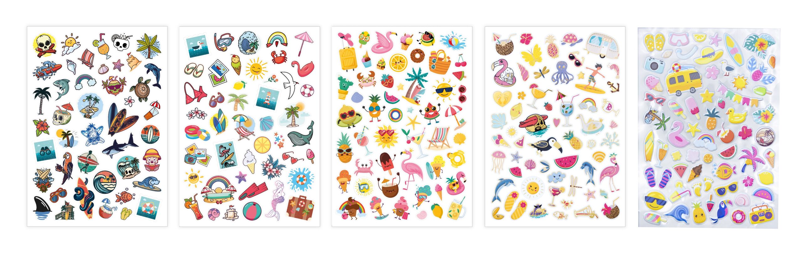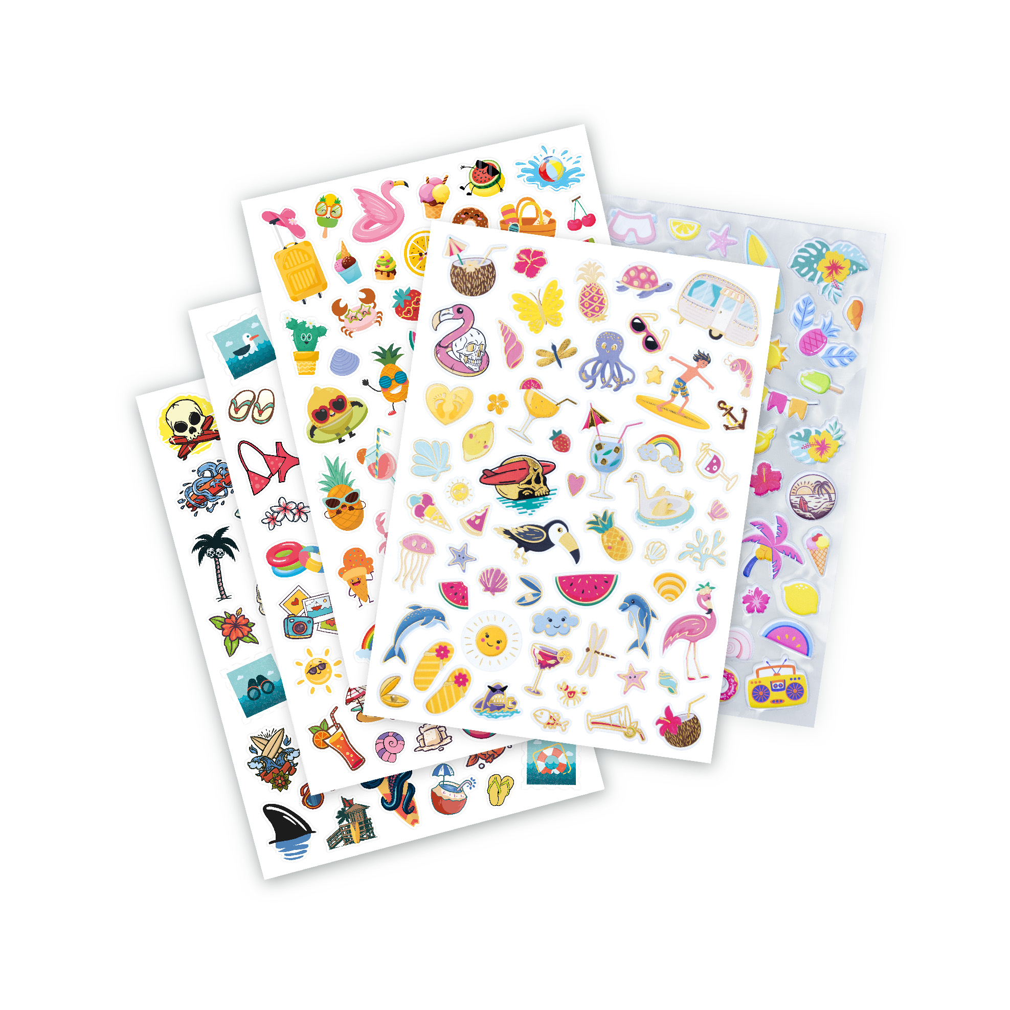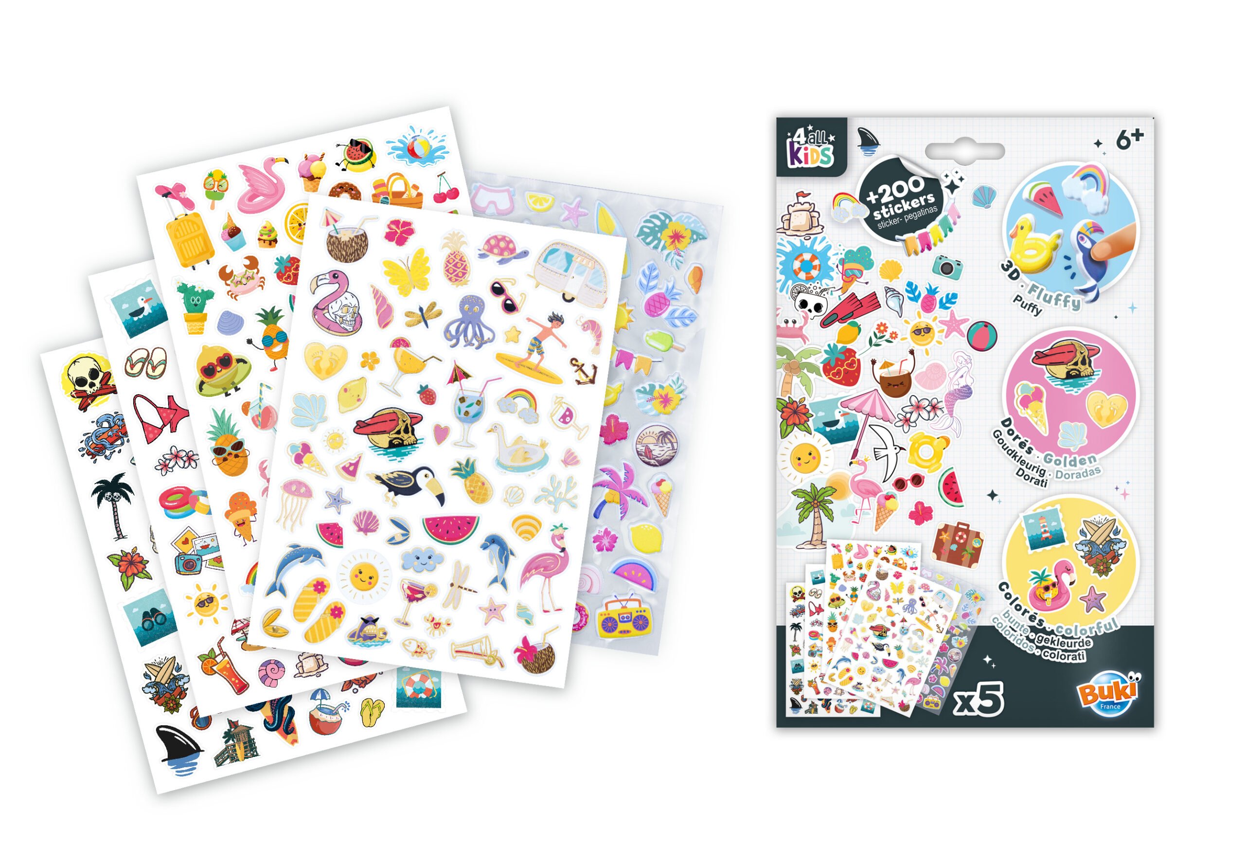 Buki suveteemaline kleebiste komplekt on laste kleepsukomplekt 200+ suve ja puhkuse teemalise kleepsuga meisterdamiseks ja vihikute kaunistamiseks. Komplektis on viis A5 lehte värviliste kleepsudega, üks metallilise kontuuriga leht ja üks pehmete 3D-kleepsude leht. Kasuta isekleepuvaid kujundeid joonistustel, päevikus ja lemmikesemetel. Sobib alates 6. eluaastast.