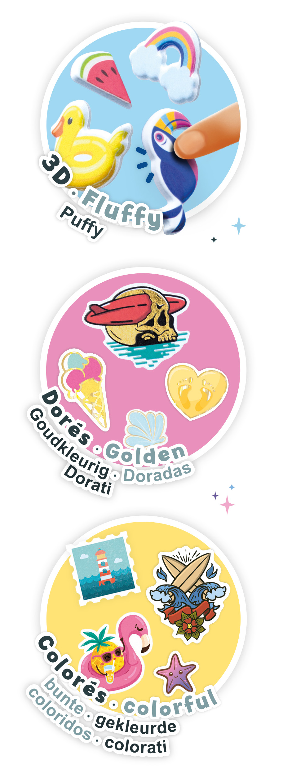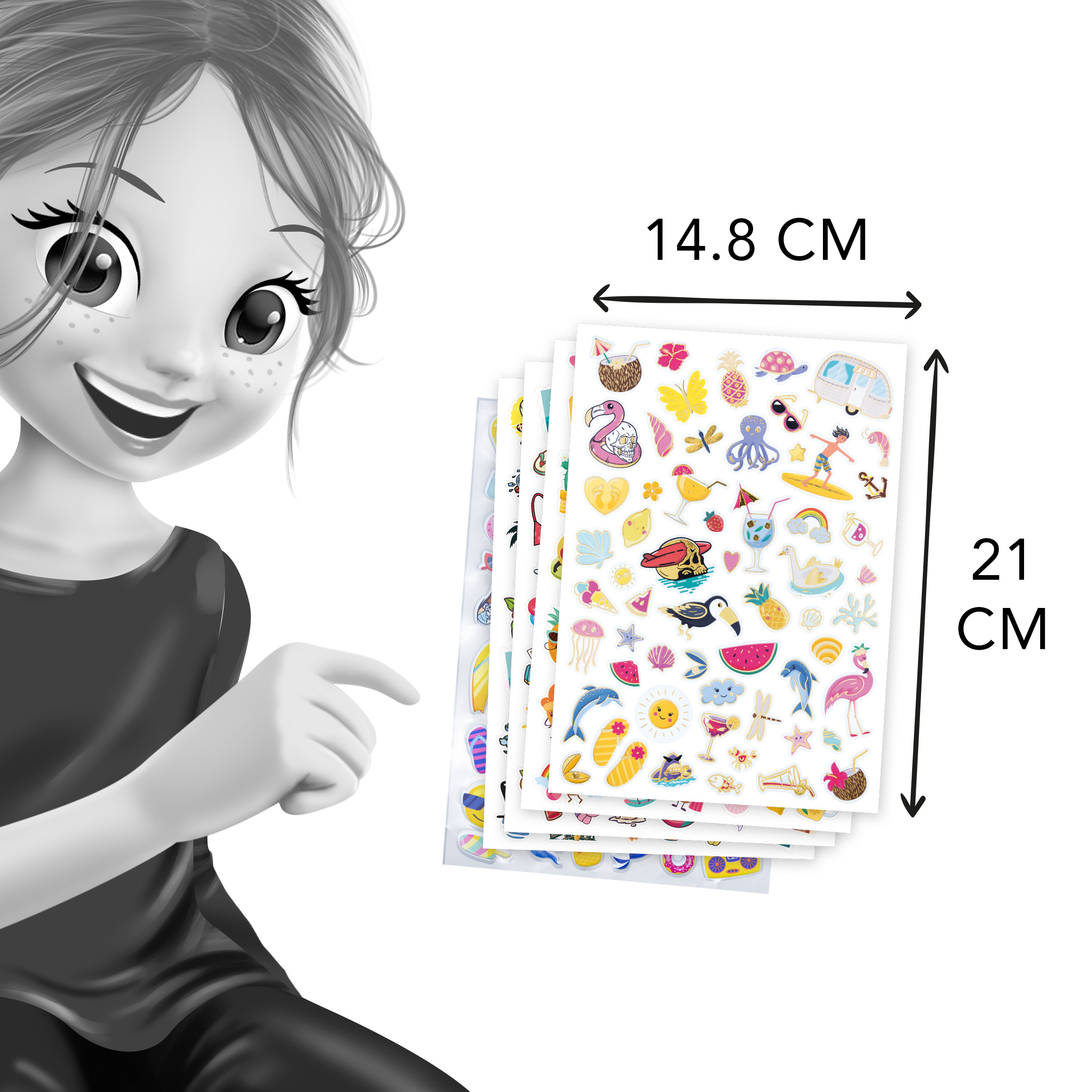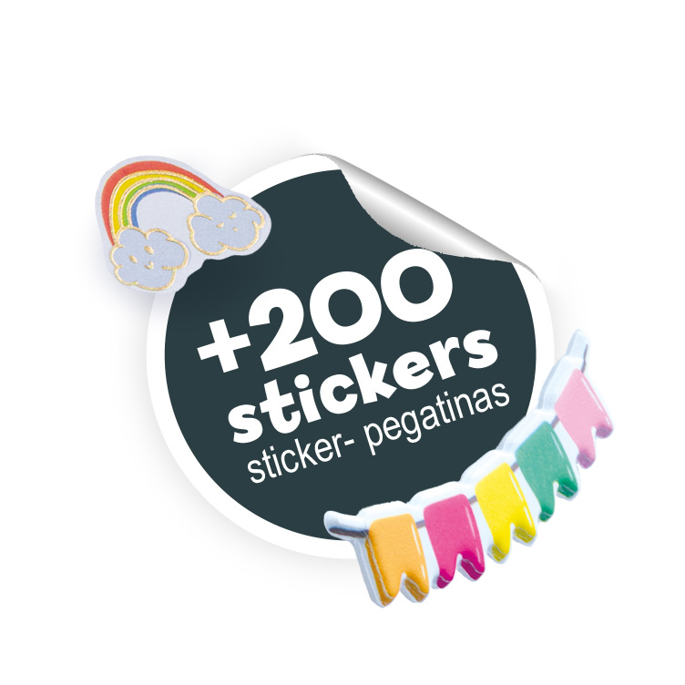 Komplekt sisaldab: 5 A5 kleepsulehte kokku 200+ kleepsuga, sh 3 värvilist lehte, 1 metallilise kontuuriga leht ja 1 pehmete 3D-kleepsude leht.