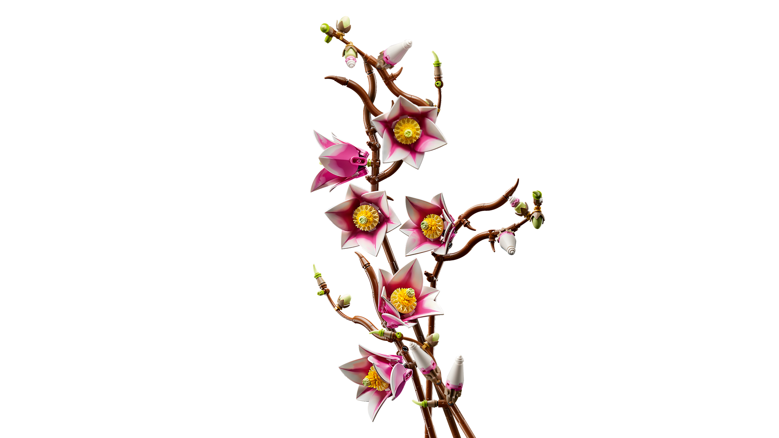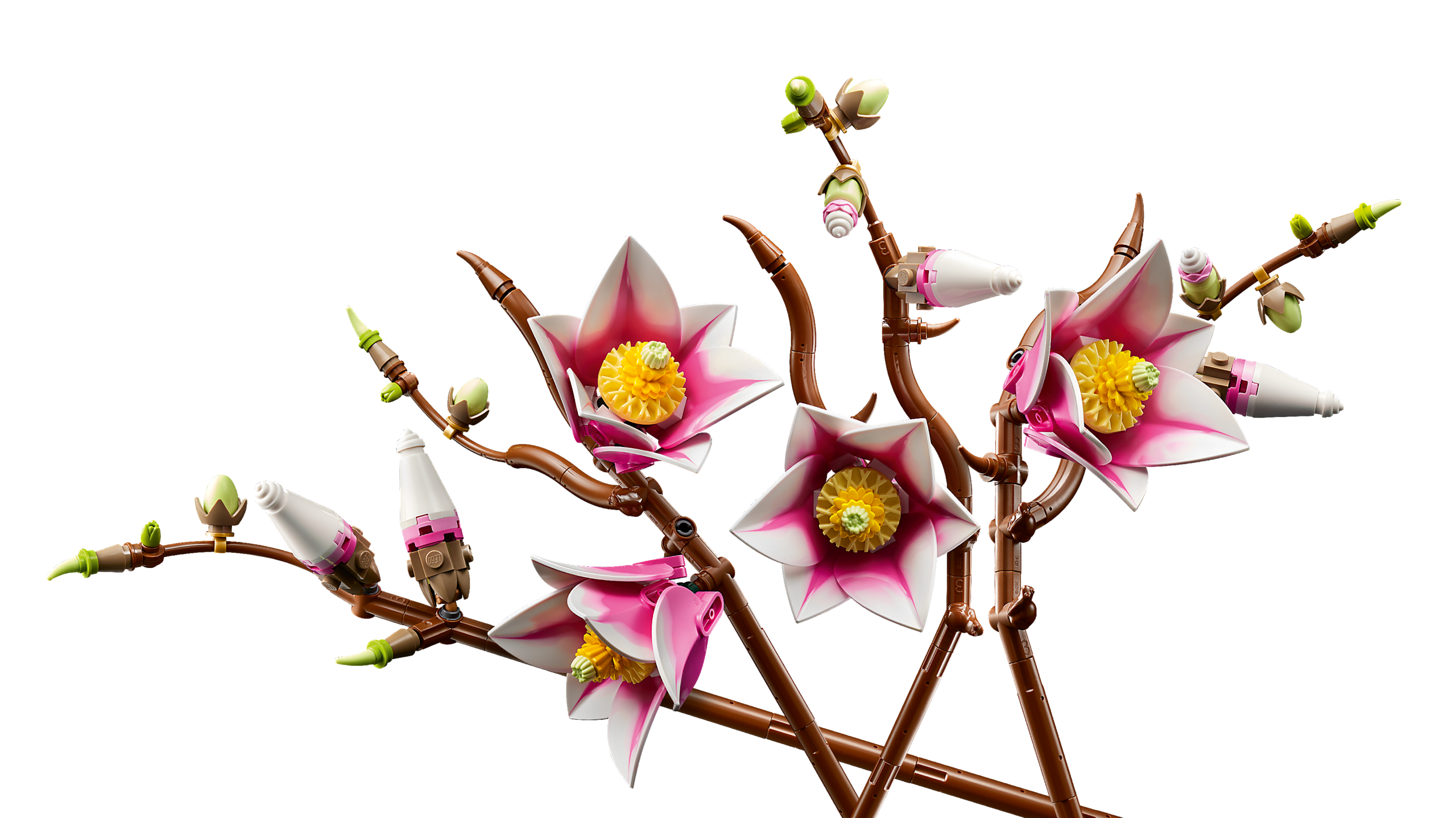 LEGO® magnooliad – Ehituskomplektis on viis magnooliaoksa, kus kaks oksa näitavad õite täielikku arengut, alates pisikesest pungast kuni avatud õisikuni