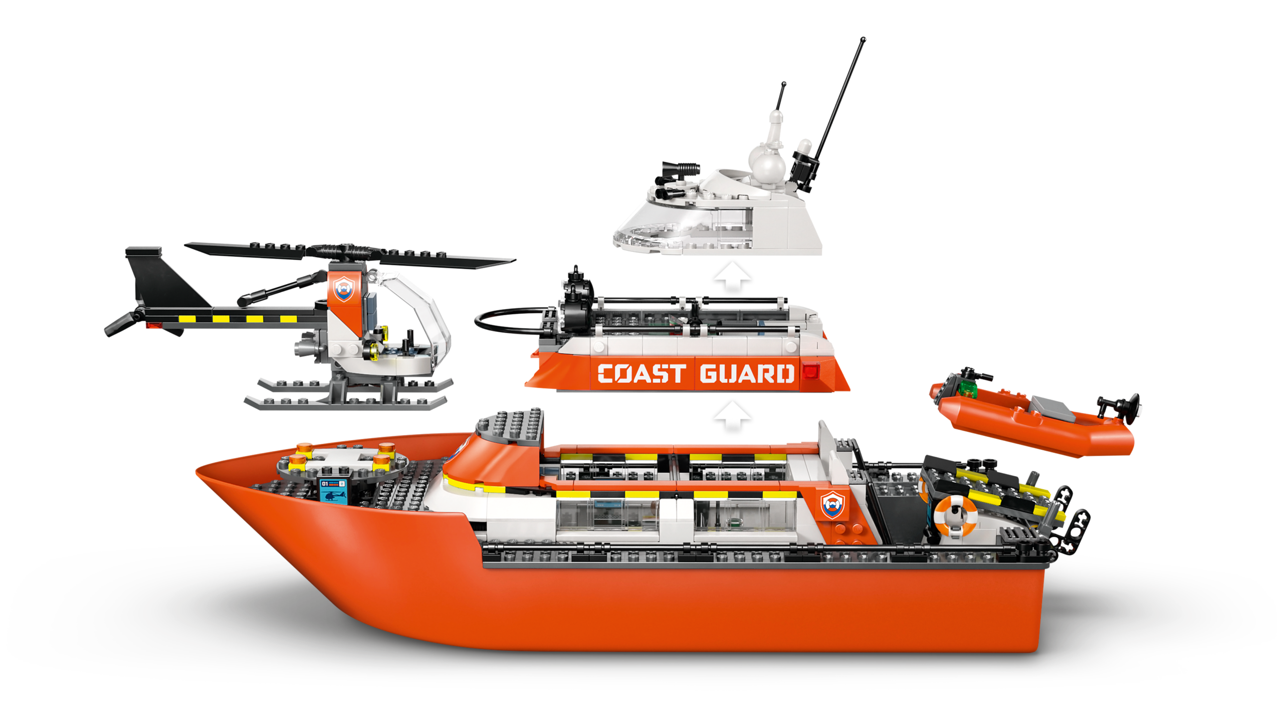 MÄNGUKOMPLEKT – Lapsed saavad eemaldada paadi tekid, et uurida juhtimissilda, kööki ja magamisruume, ning lasta vette päästepaadi otsingu- ja päästeoperatsioonideks