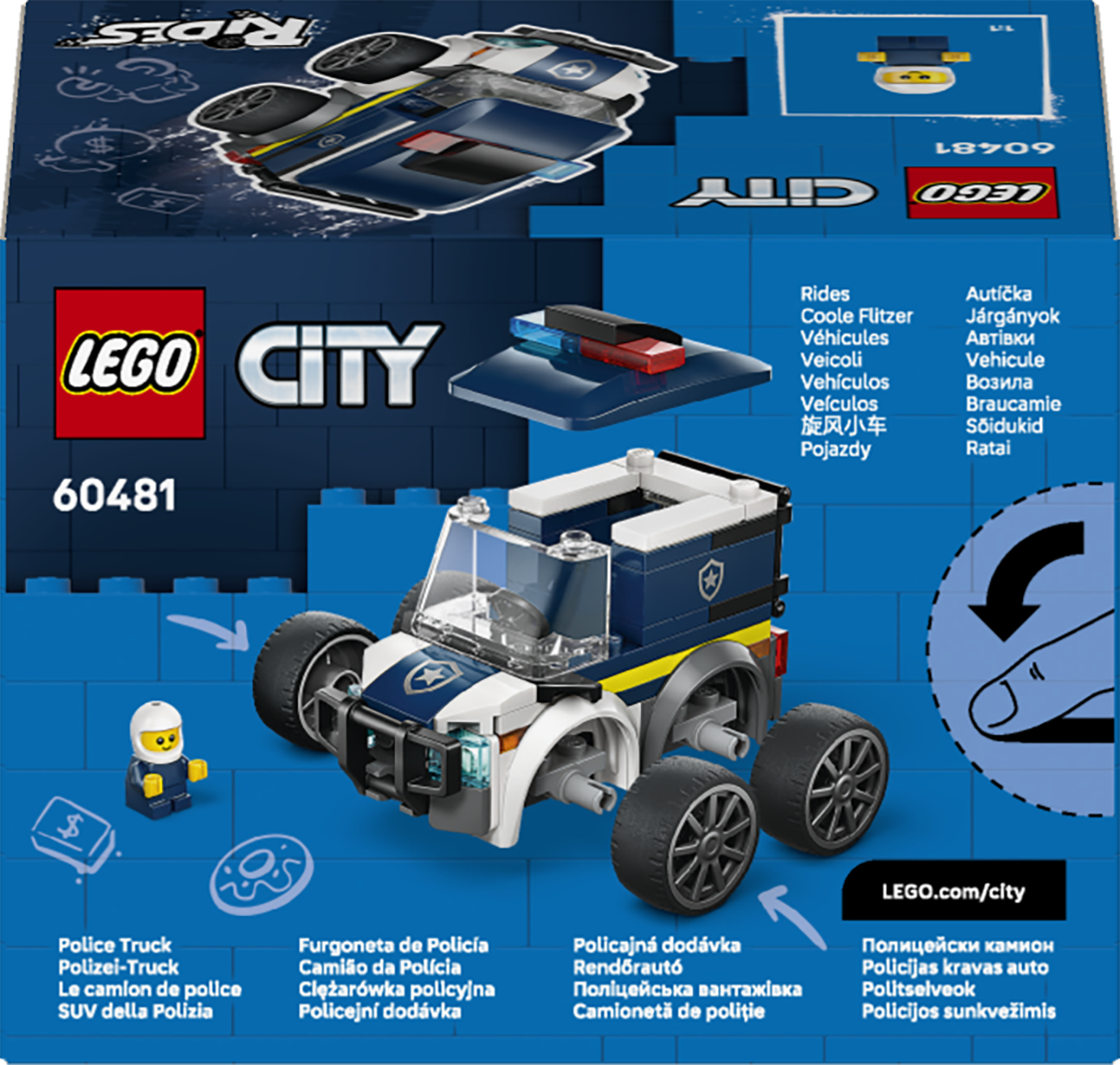 Päästa valla tegevusrohked politseiseiklused LEGO City Sõidukid – politseiveoki (60481) miniehituskomplektiga lastele alates 5. eluaastast.