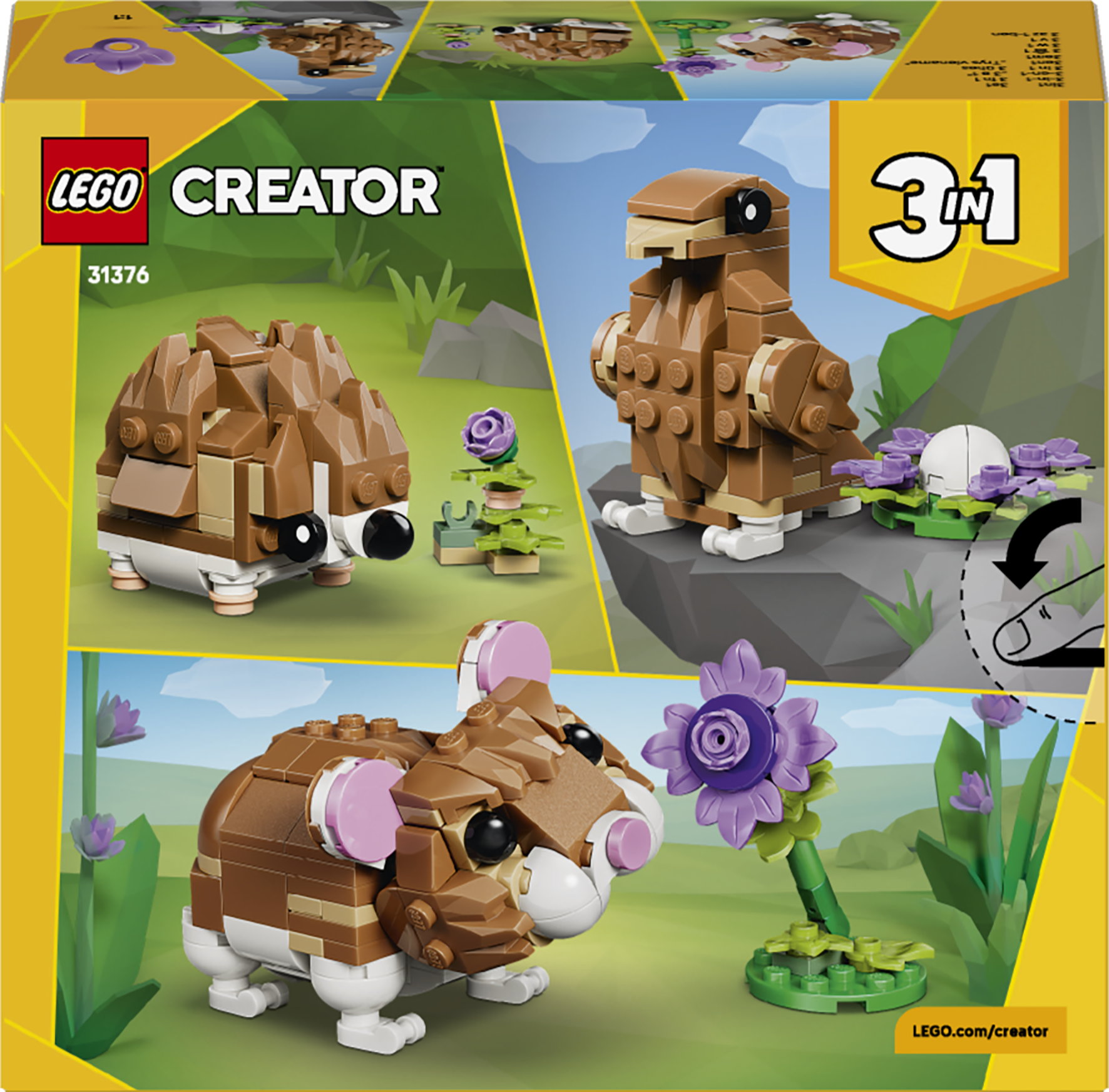 Lõputud mänguvõimalused – Mängi lõbusaid lugusid kolme väikese loomamänguasjaga (mudeleid ei saa korraga koos ehitada): armas hamster, lillega siilike või linnupesa ja munaga kotkas
