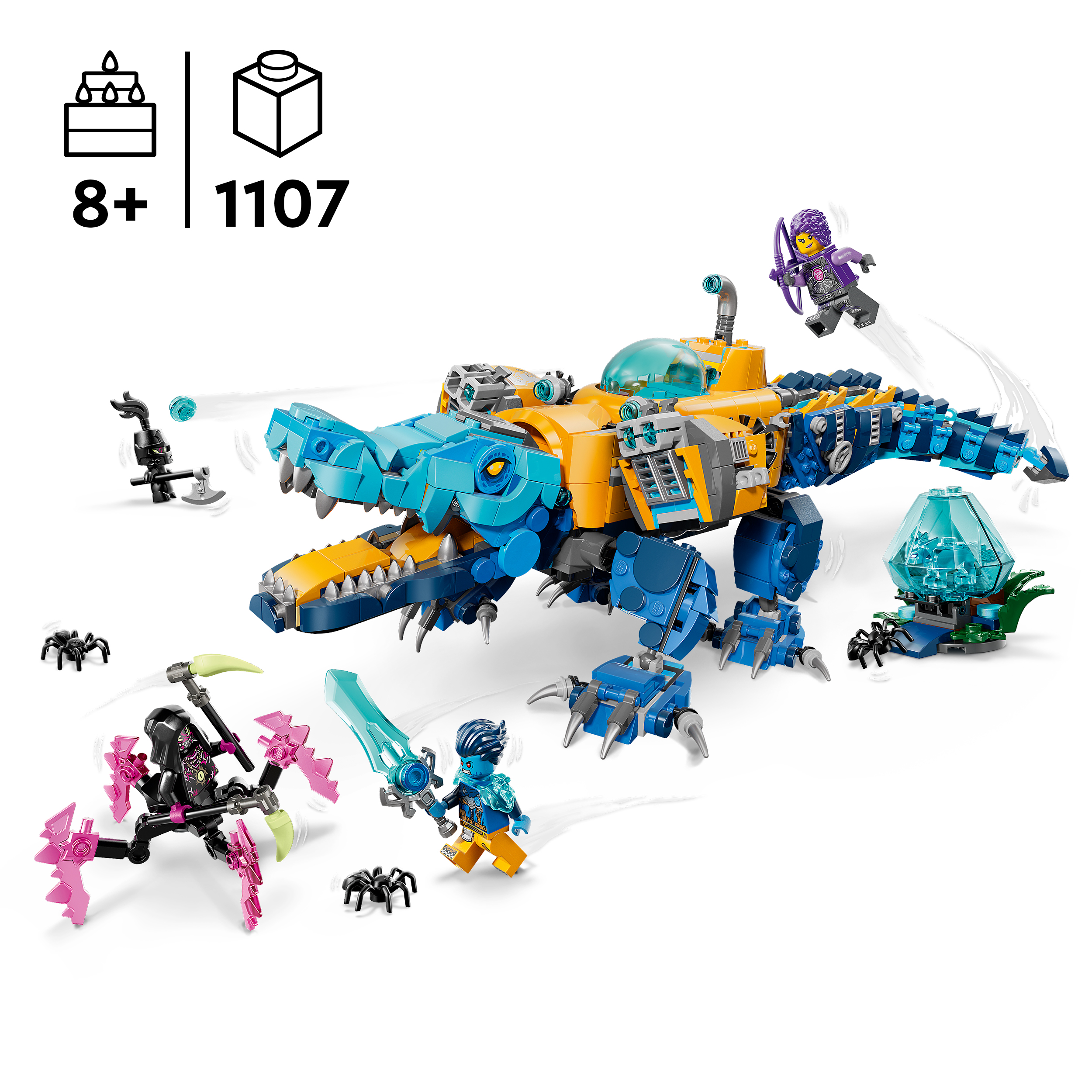3 minifiguuri – Logani, Zoey ja Arika minifiguurid, lisaks põrgusigitise figuur, 2 ämblikku ja kogutav sinine aarete olend soodustavad loomingulist rollimängu