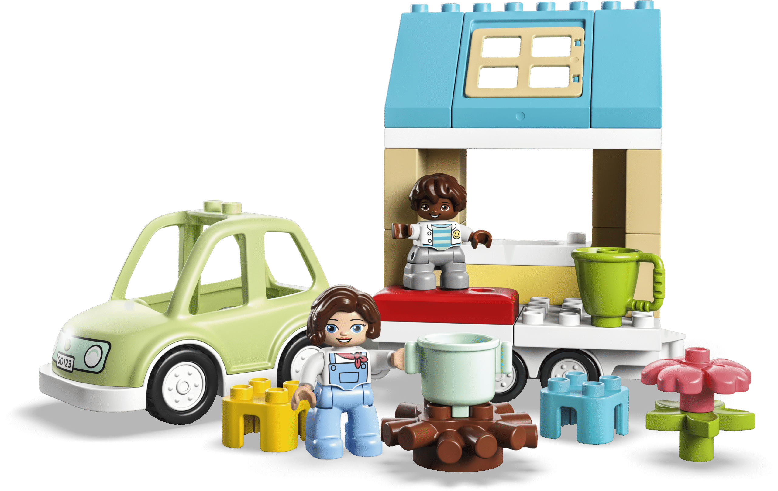 • Kõik vajalik miniseiklusteks olemas – komplektis on juhitav auto, mis mahutab täiskasvanu ja lapse minifiguuri, väike ratastel maja, mille saab mänguauto küljest eemaldada, lõkketuli, tass ja kann