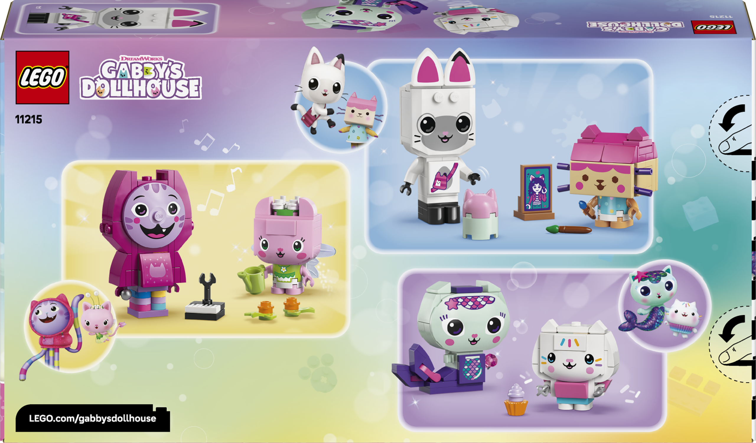 Ehita lõbu Gabby klotsidest kokkupandavate kassisõpradega (11215), kus on kuus Gabby nukumaja tegelaskuju 6-aastastele ja vanematele tüdrukutele ja poistele.