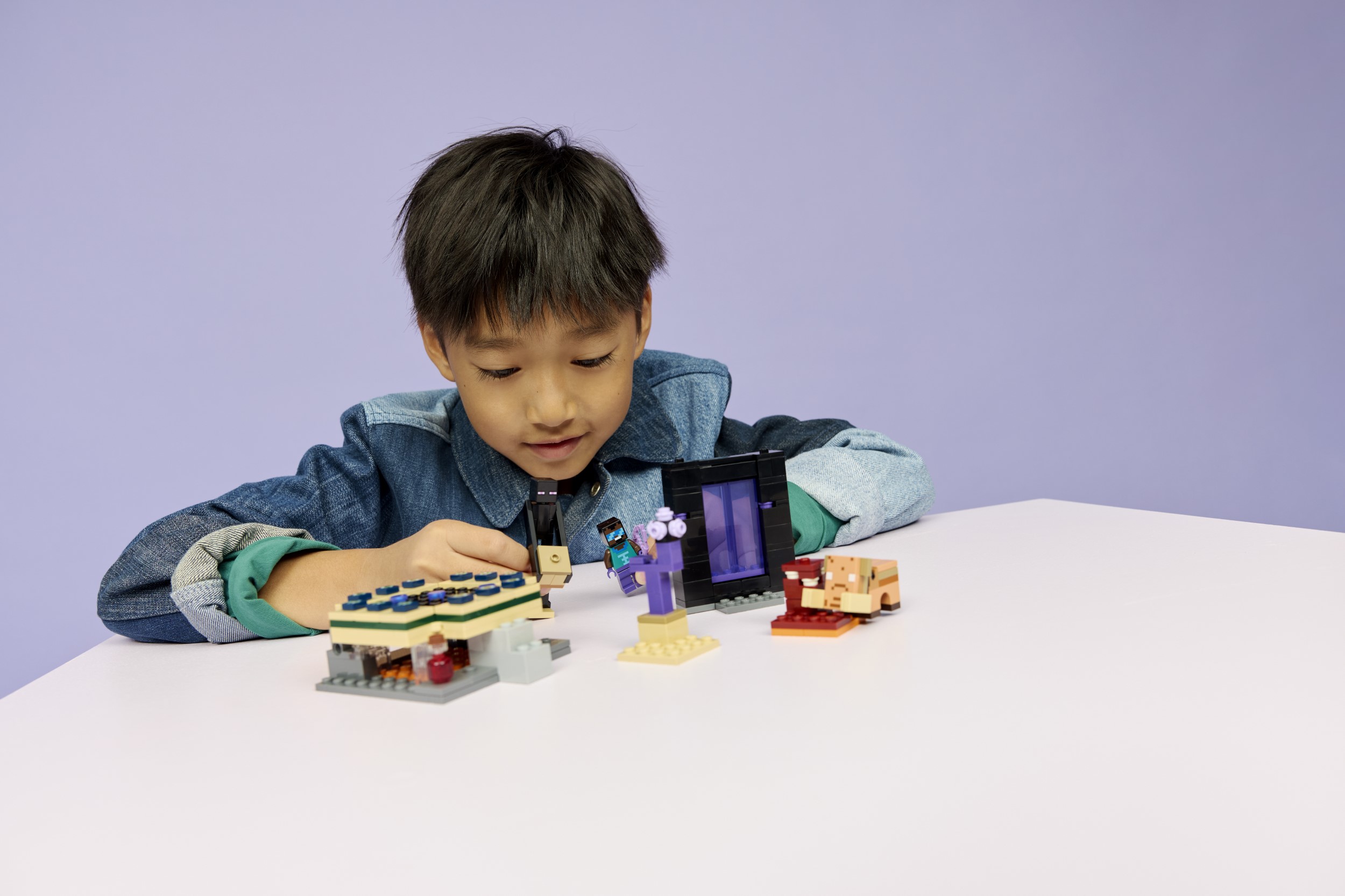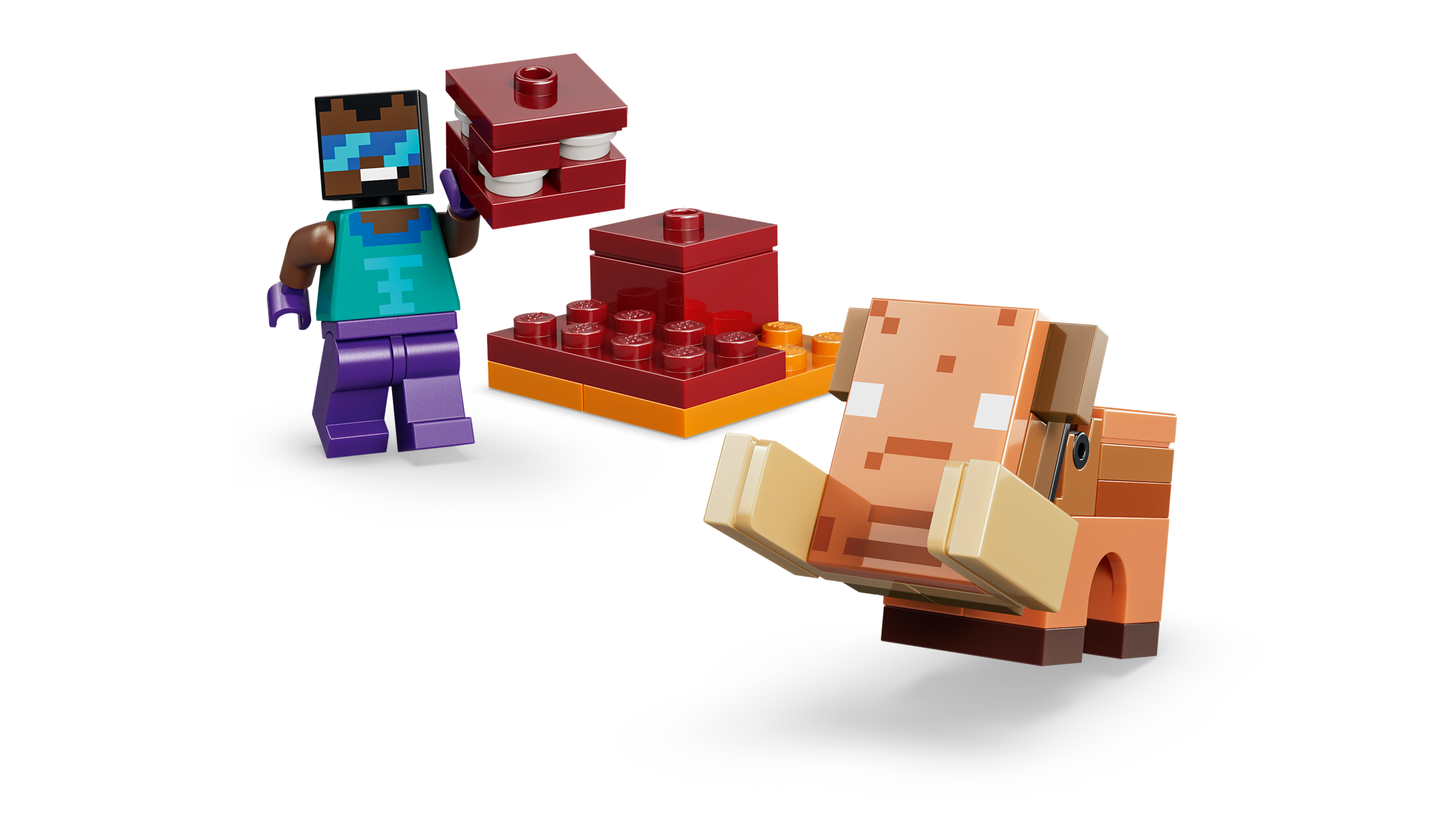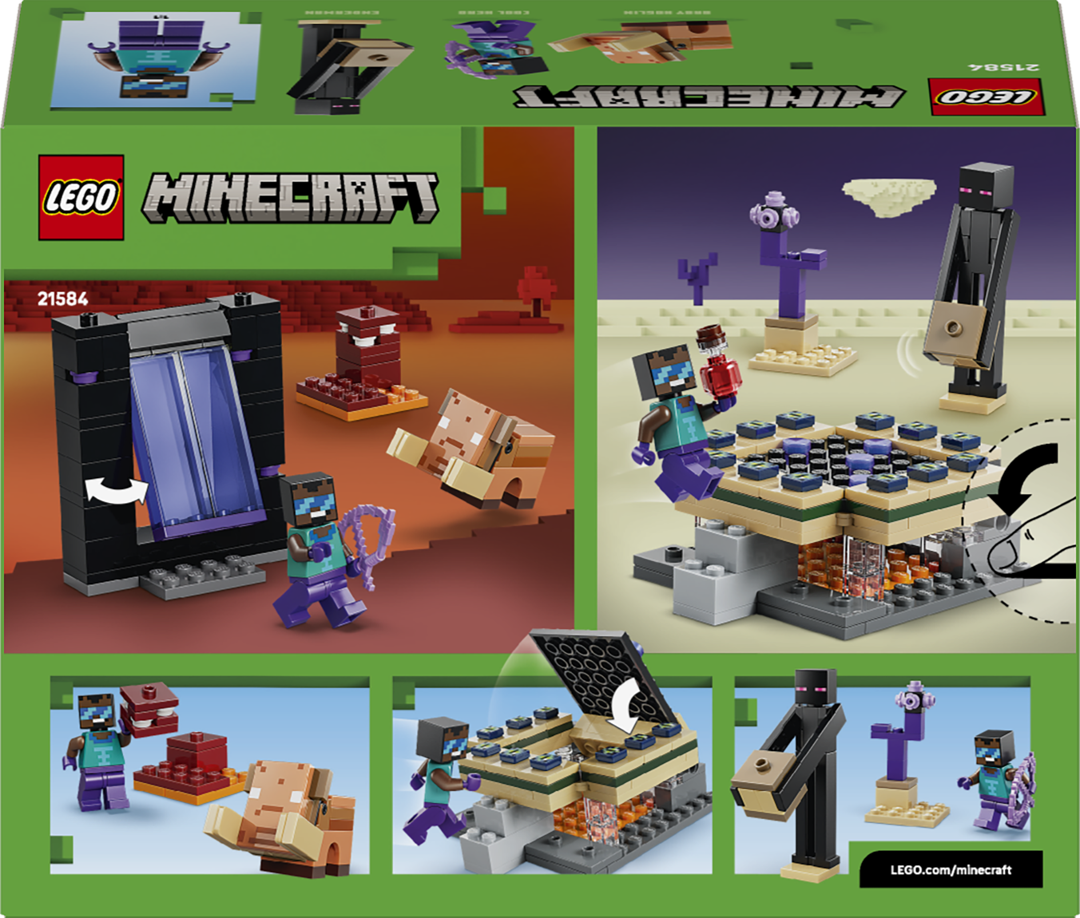 3 tegelaskuju, 2 portaali – aktiveeri mänguportaalid ja astu neist läbi, et leida mõlemast bioomist LEGO® mudel ja Minecraft® tegevus laheda kangelase minifiguuriga, lisaks Endermani ja hoglinibeebi figuurid