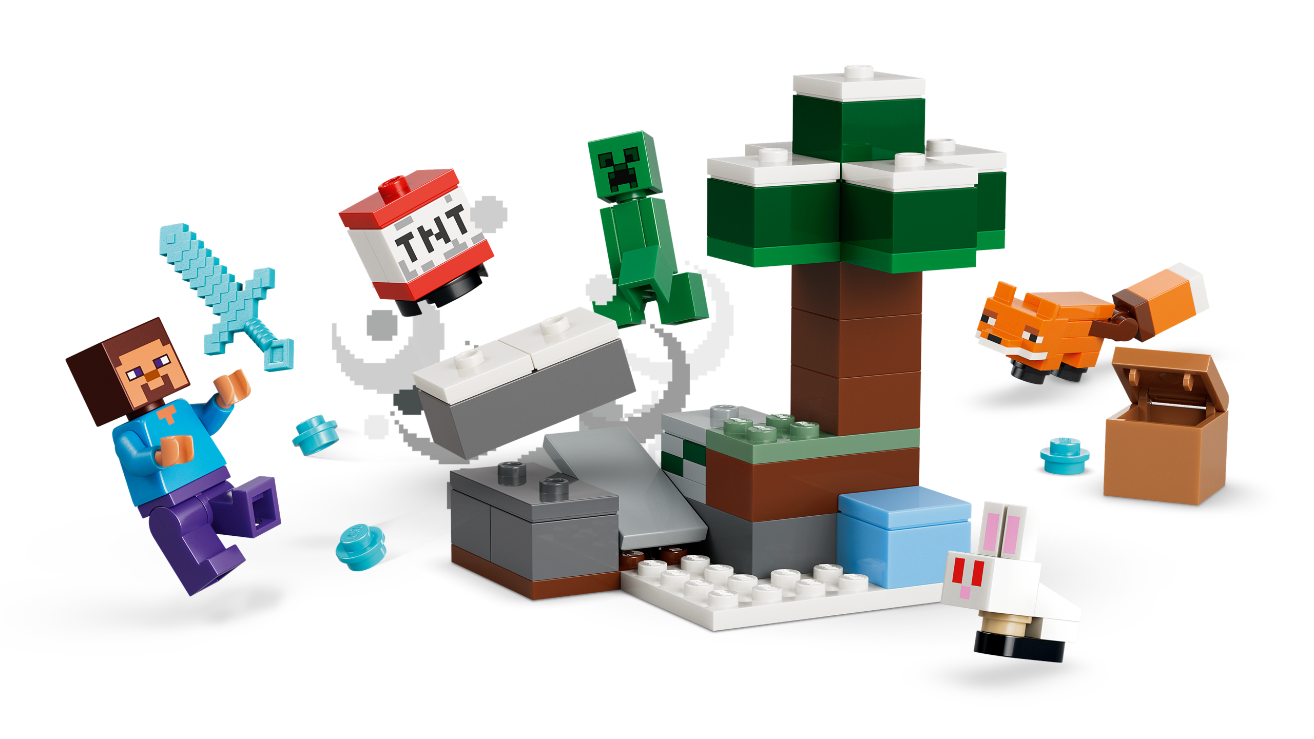 4 LEGO® Minecraft® tegelast – ehita seiklusi taigabioomis koos Steve’i minifiguuriga, lisaks Creeper ja kaks Minecrafti loomafiguuri, rebane ja jänkupoeg