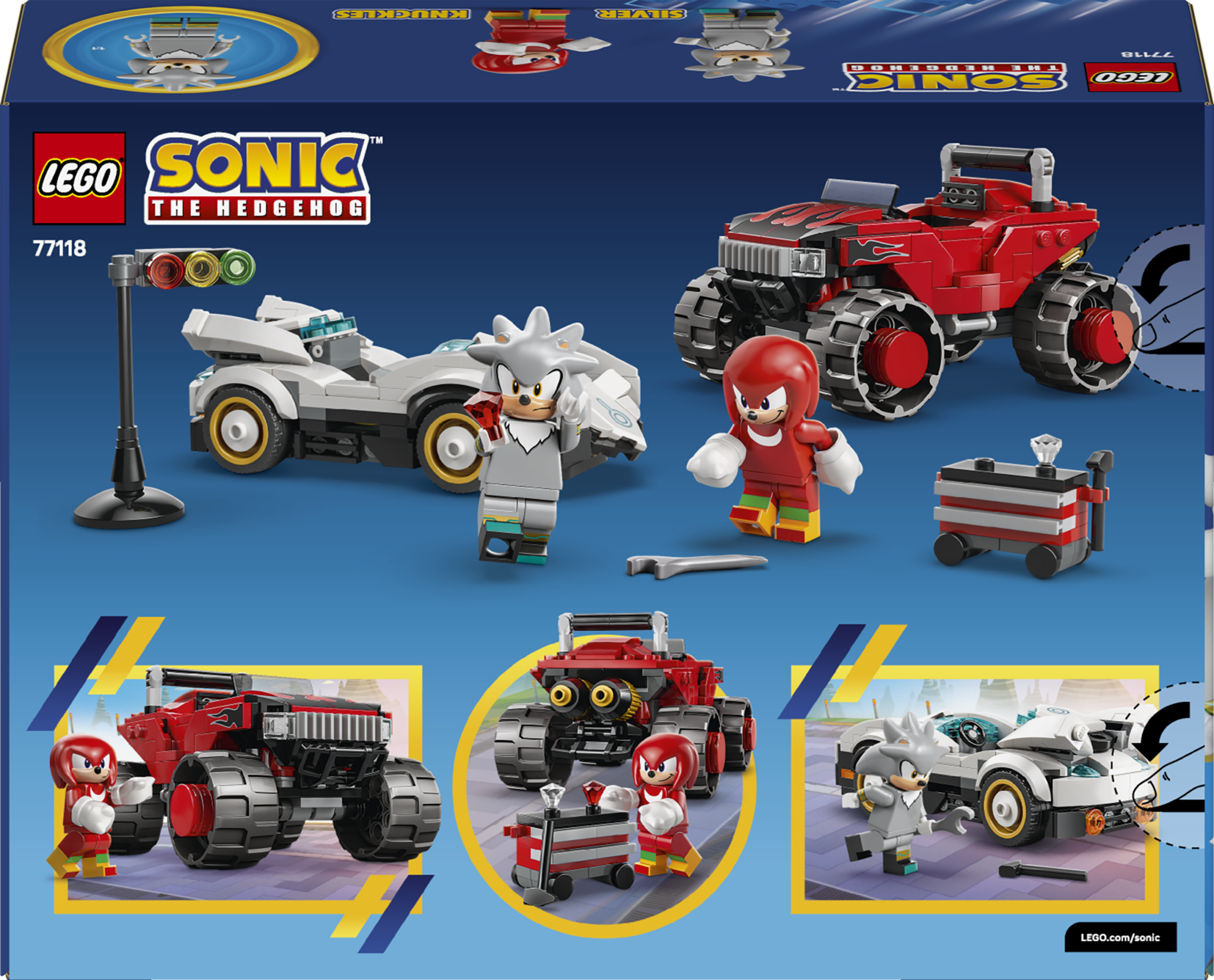 Selles LEGO Sonic the Hedgehog Silveri auto vs. Knucklesi hiigelveoki (77118) mänguasjas ootavad lapsi võidusõiduseiklused.
