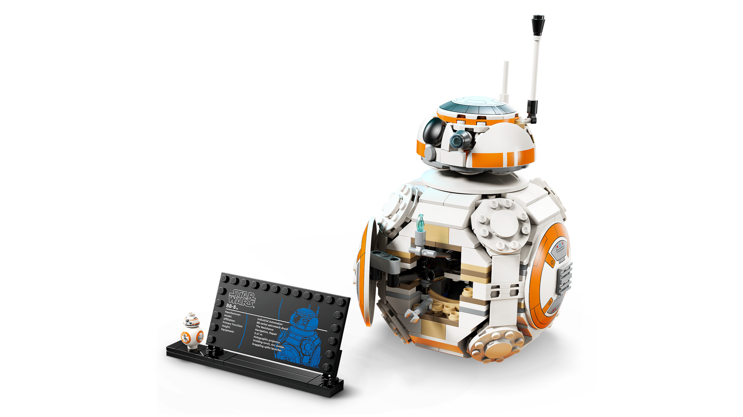 BB-8 LEGO® figuur – Esitle peamist kokkupandavat mängumudelit BB-8 infotahvli ja standardsuuruses BB-8 LEGO figuuriga