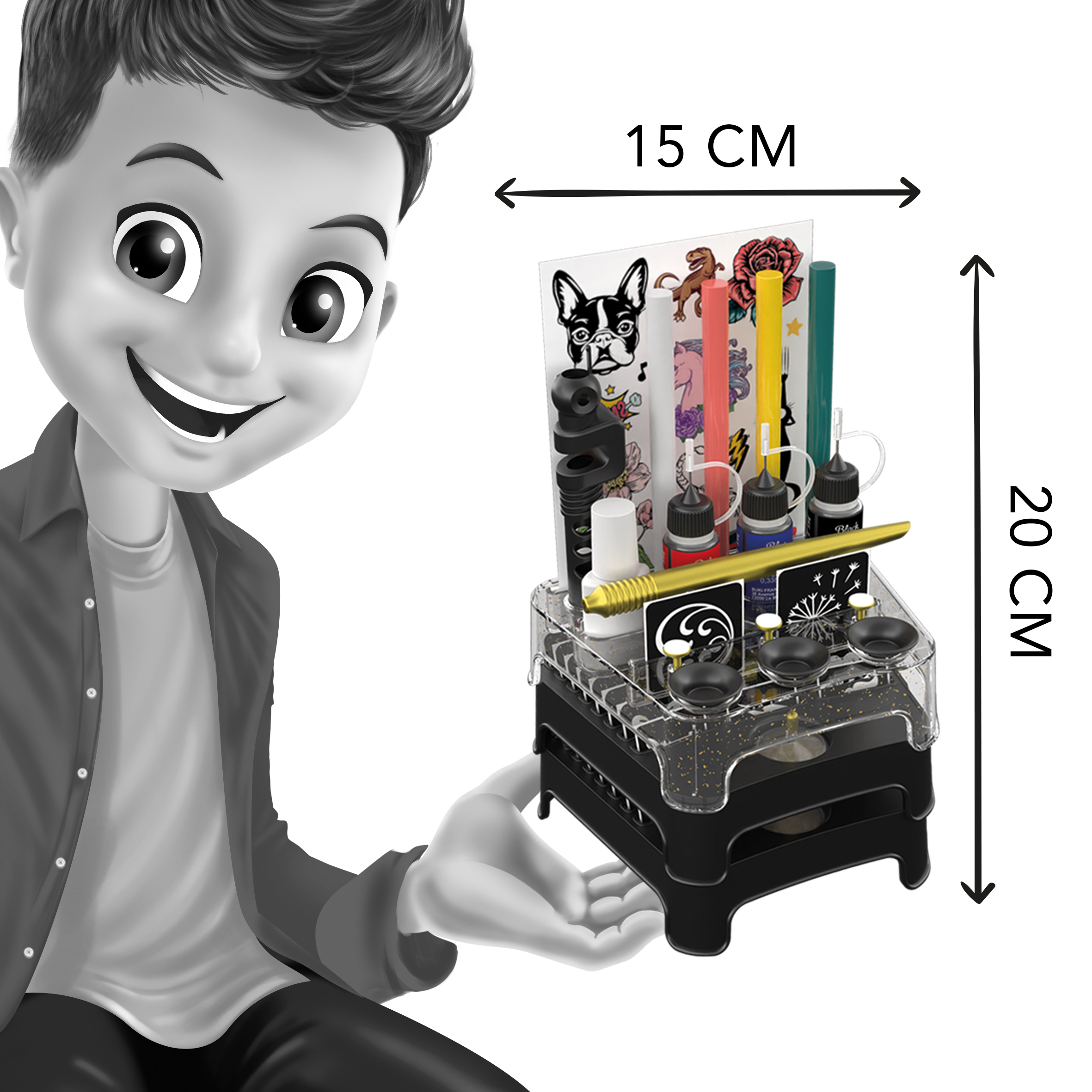 See põnev Buki professionaalne tätoveerimisstuudio pakub lastele võimalust luua omaenda kehamaalinguid, katsetada värvide ja mustrite sobitamist ning väljendada julgelt oma ideid. Komplektis on kõik vajalikud töövahendid ja lihtsad juhised, et teha efektseid, ajutisi tätoveeringuid ilma segaduse ja ohtudeta. Komplektis on 4 lehte ajutisi tätoveeringuid, sealhulgas värvilised ja pimedas helendavad kujundid. Tegevus arendab peenmotoorikat, iseseisvust ja annab juurde enesekindlust.